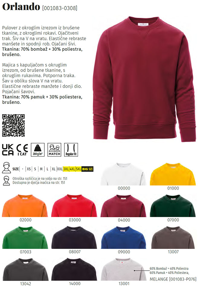 - material: 280 g/m², 80% bombaž, 20% poliester, brušen flis,